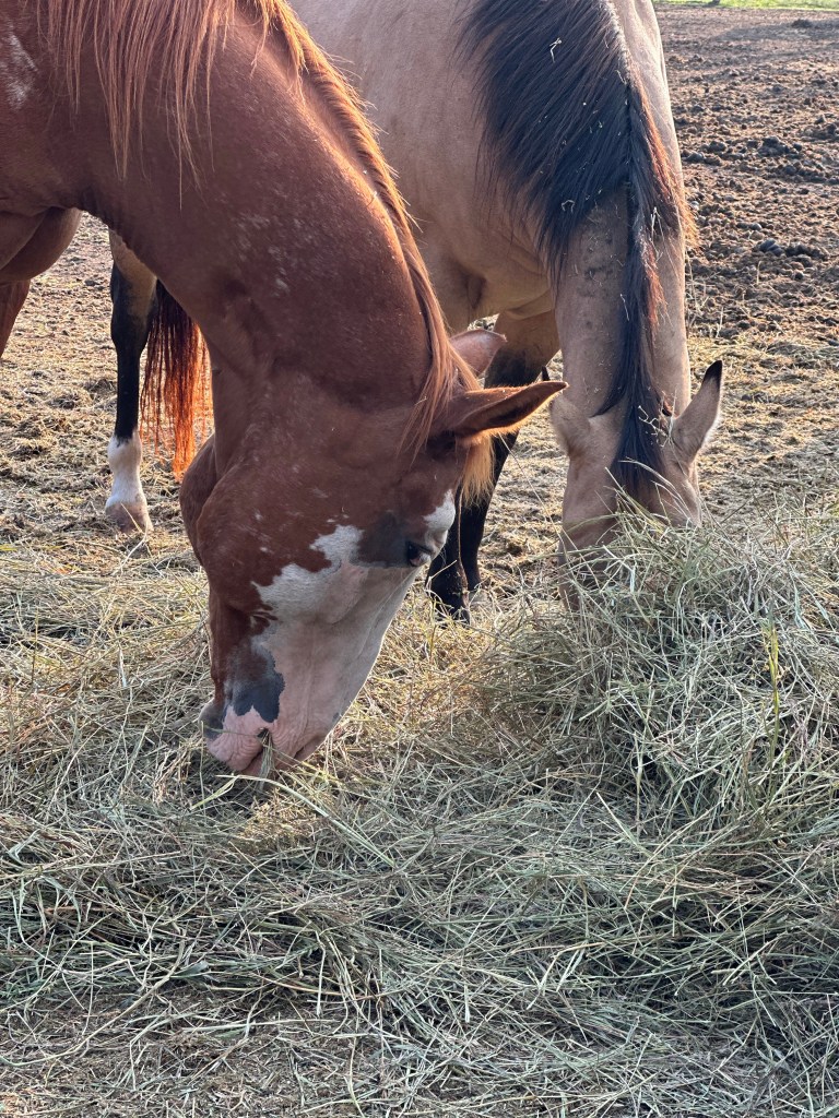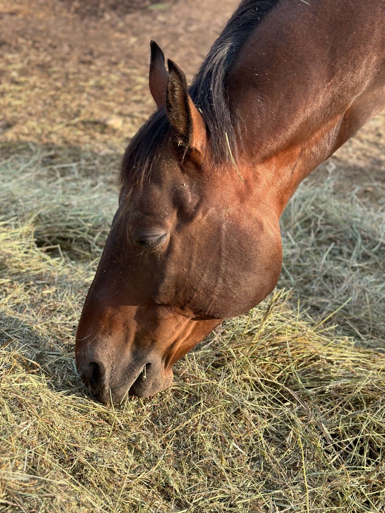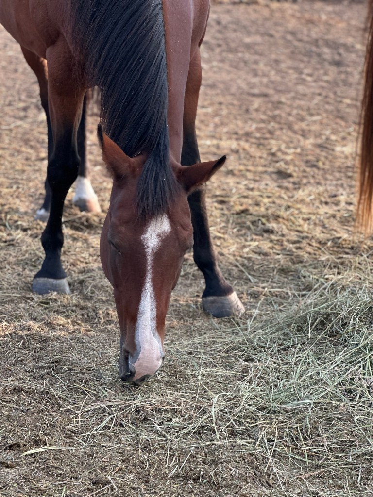 From there I am off to meet the horses as they are hungry and quite talkative as they wait for their breakfast. All of them are quite excited as the food comes over the fence. They are happy to see me, but once there is food on the ground it is a lot like “Doug who “.