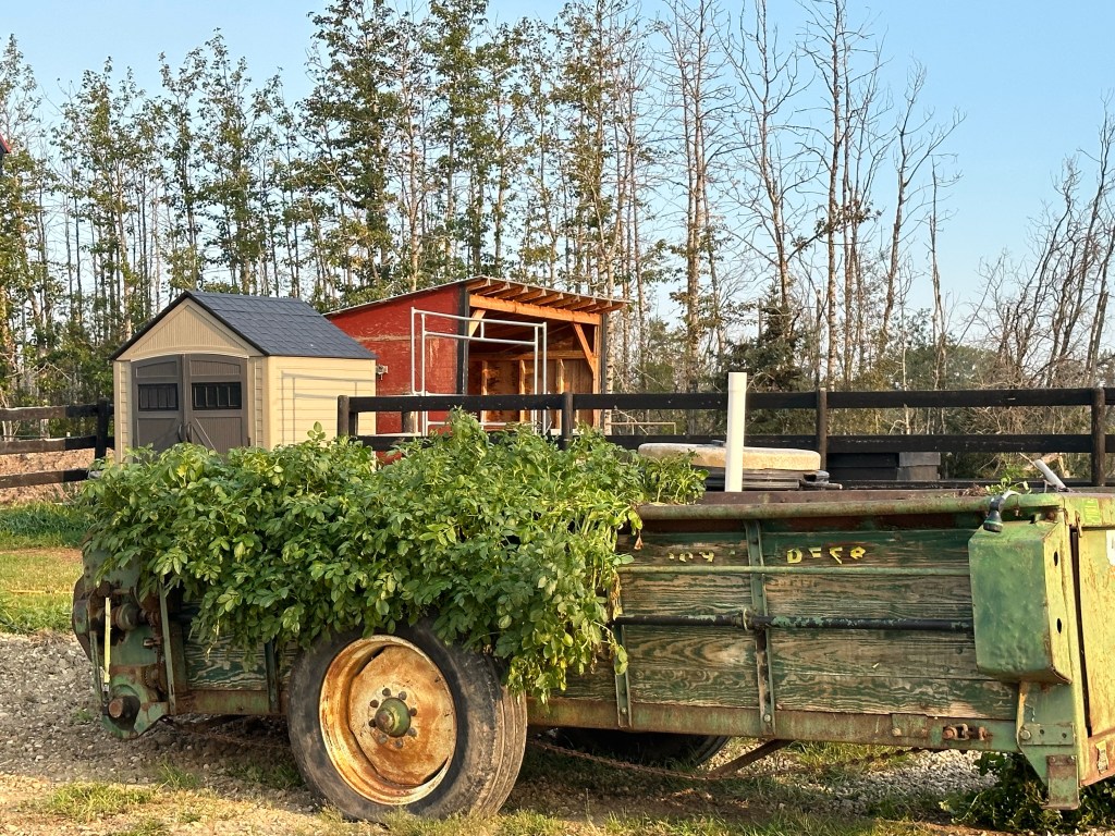 Now it is time to harvest some potatoes for dinner tonight. We are growing them in an old manure spreader. I took out about 4 plants and ended up with 12 pounds of potatoes. There is nothing better than potatoes fresh from the garden. I have them peeled and ready for tonight.